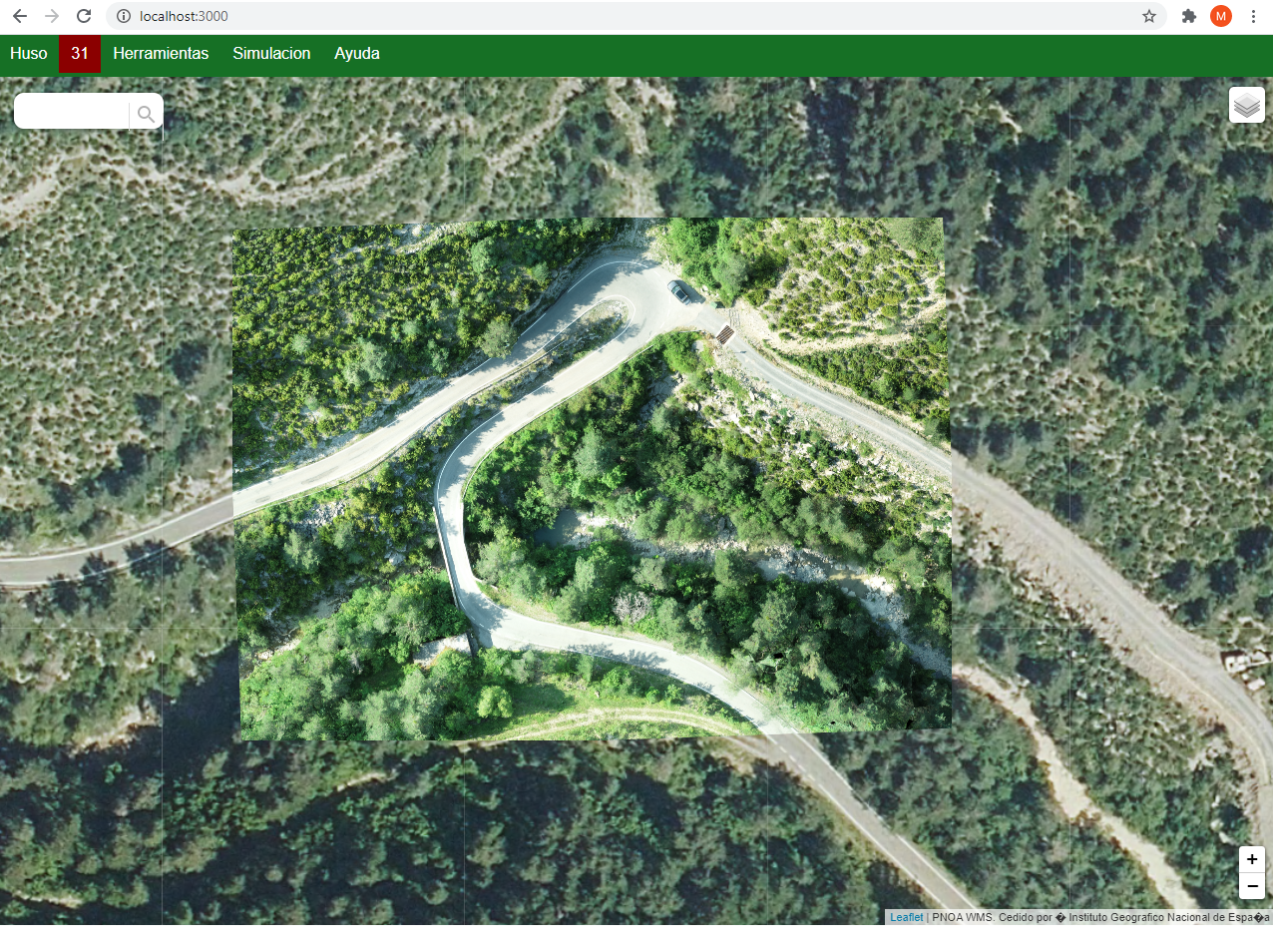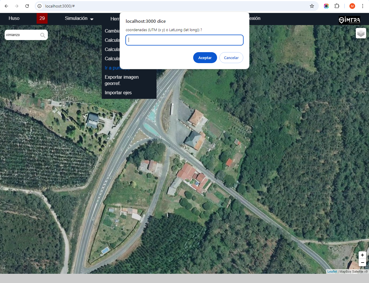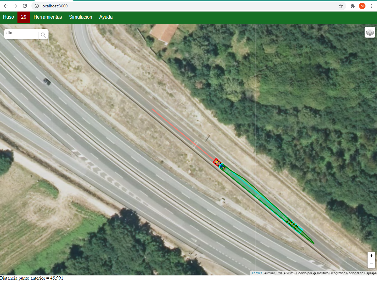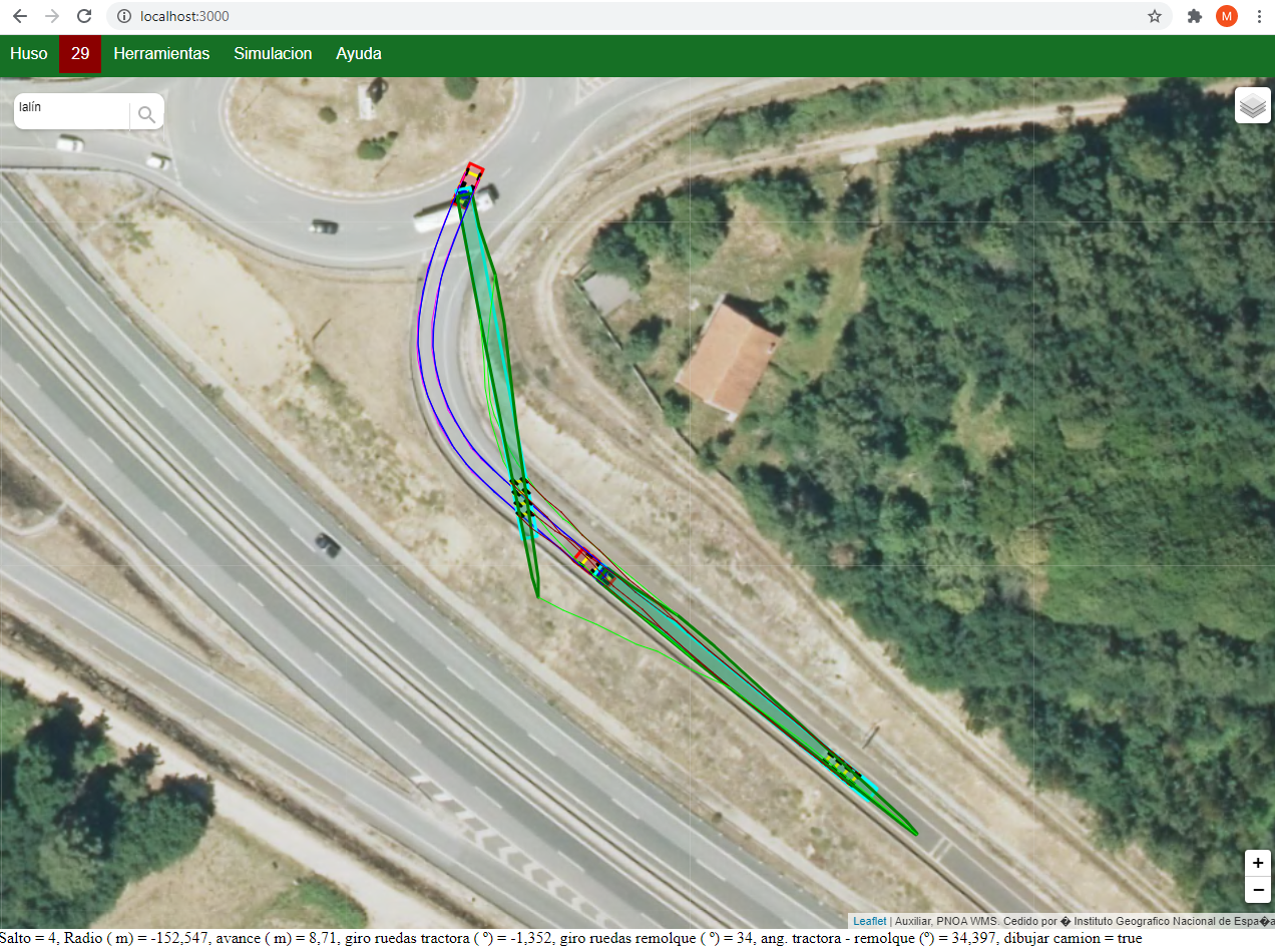 La aplicación SIMTRA, a partir de la geometría y dimensiones del vehículo especial, y de las ortoimágenes de satélite existentes, facilita la verificación geométrica de la viabilidad del transporte, que se hace directamente en el navegador web, sin necesidad de descargar ortofotos.