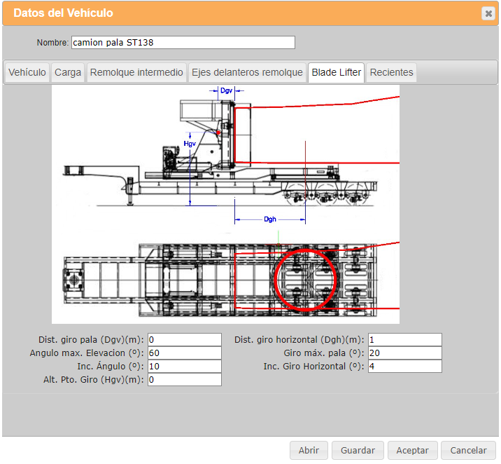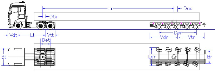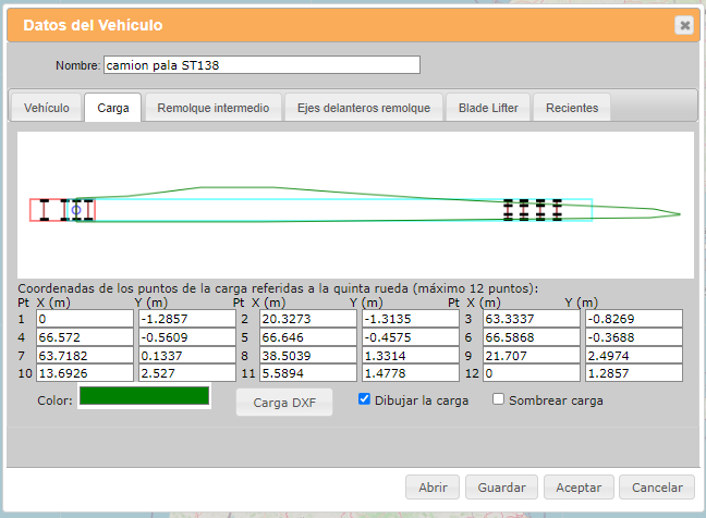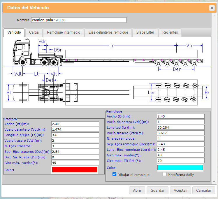 La definición de la geometría del vehículo y su carga se hace mediante un sencillo formulario al que se accede en la opción "simulación", "editar vehículo". La aplicación está orientada inicialmente a vehículos articulados de dos unidades. En el diálogo, se define la geometría del vehículo en planta, coordenadas cartesianas que definen la carga, y ángulos de giro máximos de las ruedas de la unidad tractora, del remolque, y ángulo máximo permitido entre tractora y remolque. Asimismo, se pueden seleccionar los colores en los que se representarán las diferentes unidades.