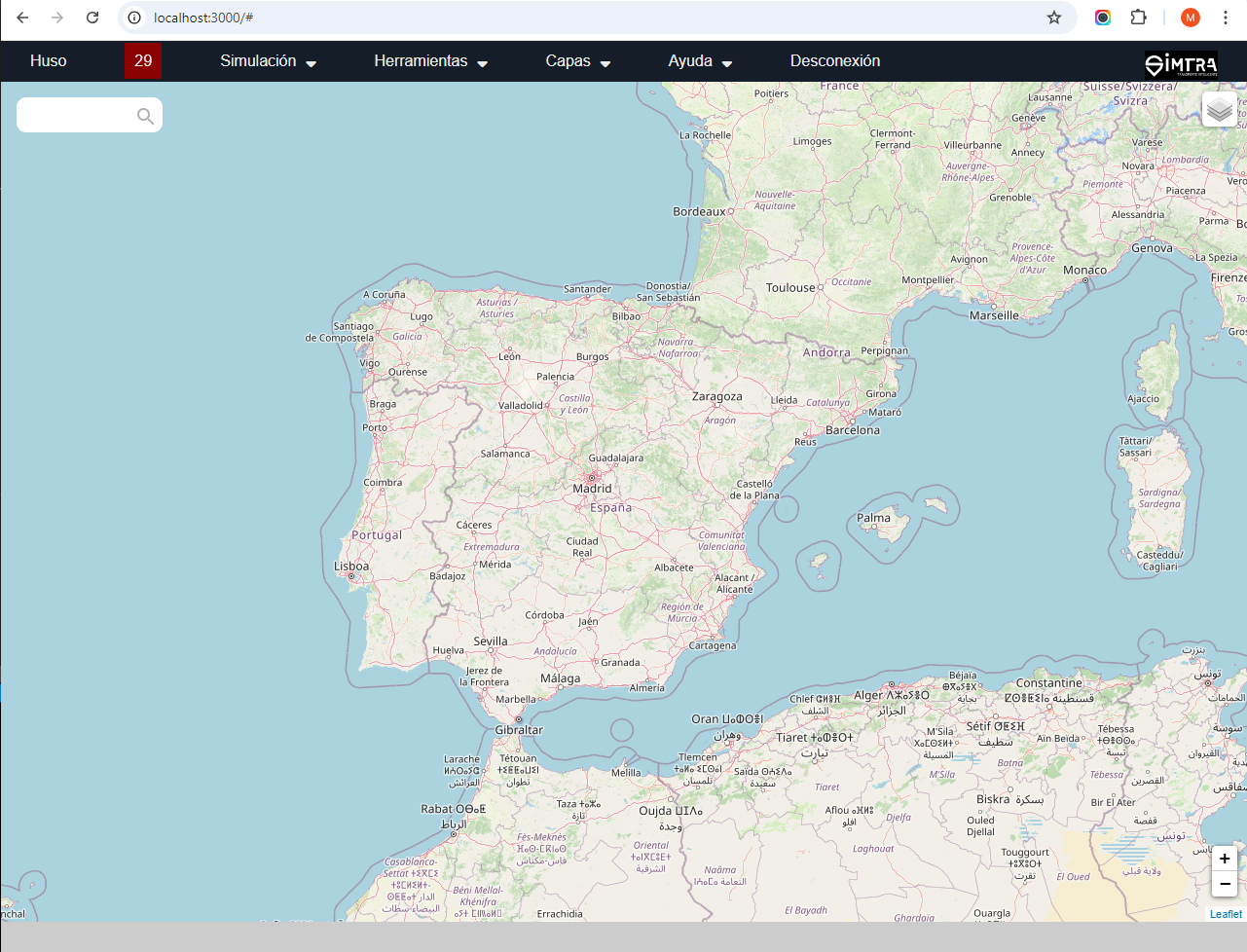 En la parte central, aparece el mapa de la aplicación, con controles de búsqueda (esquina superior izquierda), control de capas (superior derecha) y zoom (inferior derecha).