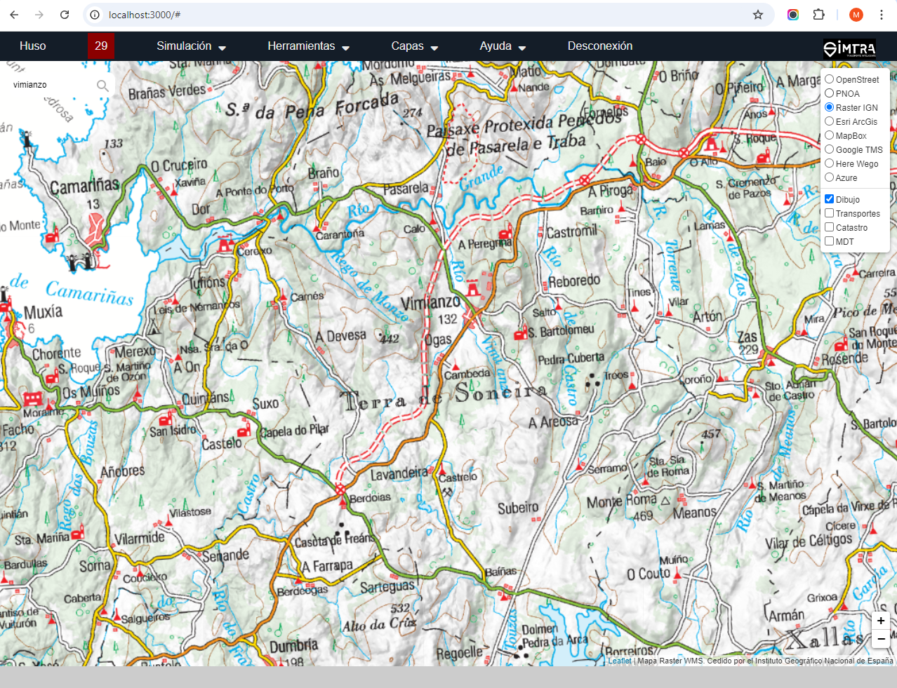 La aplicación permite seleccionar las capas correspondientes a la cartografía de "OpenStreetMaps" e IGN, facilitando la búsqueda del emplazamiento donde se quiere llevar a cabo la simulación.